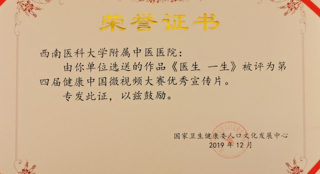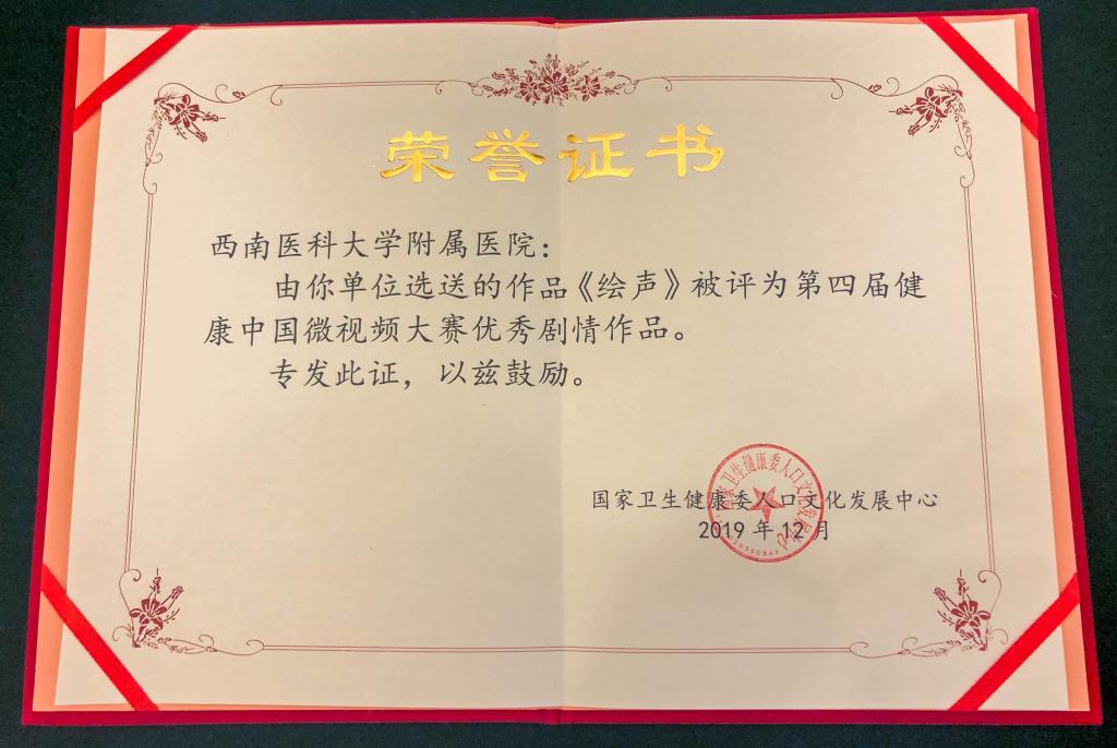 12月7日,由国家卫生健康委人口文化发展中心主办,国家卫生健康委卫生健康文化推广平台、中国家庭报社、新华网等承办的“第四届健康中国微视频大赛揭晓仪式”在北京全国人大会议中心举行。临床医学院·附属医院《绘声》荣获“优秀剧情”奖,中西医结合学院·附属中医医院记录孙同郊教授视频《医生一生》荣获第四届健康中国微视频大赛优秀宣传片。