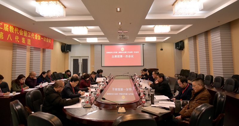 会后,主席团成员、各代表团团长随即在城北校区三会议室召开了主席团第一次会议。会议审议通过了会议日程安排,大会执行主席和主持人建议名单;审议了《大会选举办法(草案)》,第二届教代会执委会暨工会委员会委员、第二届工会经费审查委员会委员候选人建议名单,总监票人、监票人,总计票人、计票人建议名单。