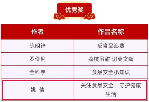 本次活动围绕食品安全“两个责任”、季节风险、一线从业者故事、基层治理、反食品浪费、防误食野生菌与醇基燃料、食品添加剂等多个主题,面向全社会广泛征集优秀作品。经过激烈角逐与严格评审,全市共评选出60件优秀作品。其中,卫校2023级药剂5班陈星宇同学的作品《儒家思想遇现代食安》荣获短文赛道二等奖;2023级药剂3班姚倩同学的作品《关注食品安全,守护健康生活》荣获短视频赛道优秀奖,2023级药剂5班张仁丽同学的作品《防误食野生菌》荣获海报赛道优秀奖。三位同学以创新的视角和扎实的专业素养,展现了卫校学子良好的精神风貌与科普传播能力。