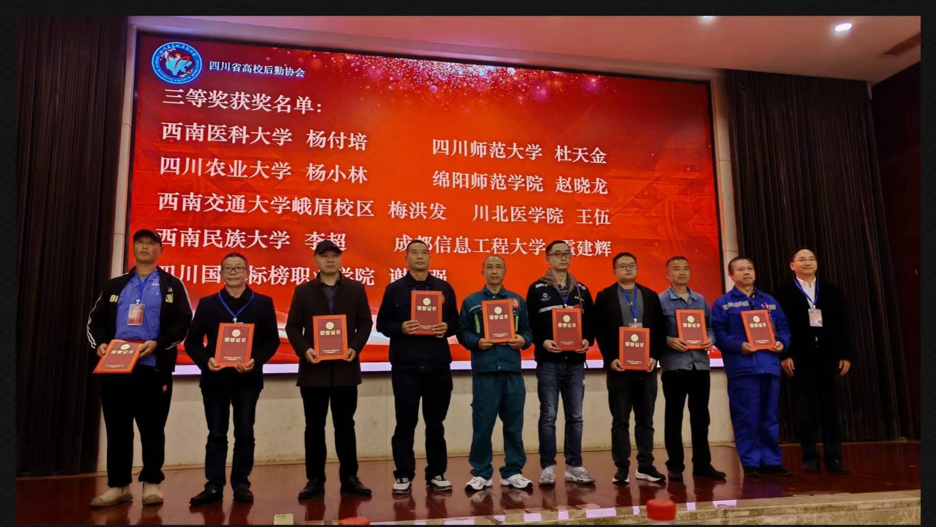 近日,四川省高校后勤协会在西南交通大学峨眉校区举办了全省高校后勤物业与绿化员工技能培训暨技能大赛,全省共28所高校参赛。通过激烈比拼,我校基建后勤处员能源维修科员工杨传奇获得电工组个人二等奖,物业管理科员工杨付培获得绿化组个人三等奖,基建后勤处代表学校获得团体奖一等奖。