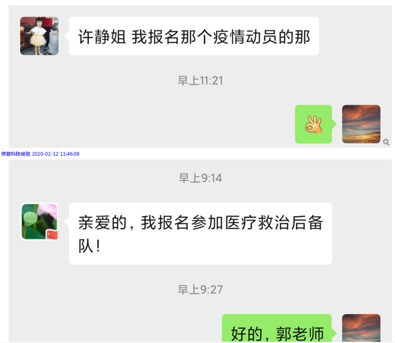 动员书一出,全院各临床科室立即响应,医师、护士、医技同仁纷纷踊跃报名,截至2月12日下午五点,已有62名医务人员报名请战!他们中有院领导、科室负责人、护士长、刚刚才结束援外医疗工作的护士、正在脱贫攻坚一线支援的医生,既有已生华发的专家教授、临床一线中坚力量,也有参加工作刚半年的萌新小医生、小护士……他们庄严承诺:“我们已经做好准备,若有战,召必上!大疫面前,即使口腔医务人员亦能成为战士!听党指挥,绝对服从!众志成城,不忘初心!”