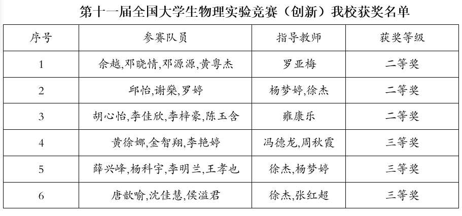 11月21日至24日,第十一届全国大学生物理实验竞赛(创新)在中南大学潇湘校区成功举办并圆满落幕。我校共派出6支队伍参加国赛,历经初赛与决赛的层层角逐,最终斩获全国二等奖3项、三等奖3项,我校荣膺优秀组织奖。