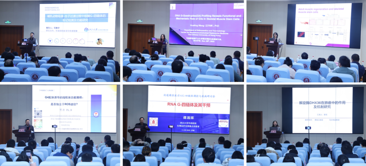 研讨会设“高层次专家学术报告”“青年学者论坛”两大板块,13位专家学者分享前沿成果。高层次专家报告环节,6位专家代表作交流:国家万人计划科技创新领军人才、浙江大学求是特聘教授范衡宇阐述《G四链体稳态调控与哺乳动物早期胚胎发育潜能的建立》;香港中文大学王华婷教授探讨《G-quadruplex Regulation and Function in Skeletal Muscle Regeneration and Aging》;陈小娜博士报告《DNA G-quadruplex profiling in skeletal muscle stem cells reveals functional and mechanistic insights》;绵阳市中心医院/华西药学院贾涛副研究员分享《G4配体诱导的线粒体功能障碍:是否独立于ROS途径?》;四川大学生物治疗国家重点实验室傅湘辉教授主讲《RNA G-四链体及其干预》;澳门科技大学与我校联合培养博士生姜霞代表导师团队,深入探讨《解旋酶DHX36在肺癌中的作用及机制研究》。