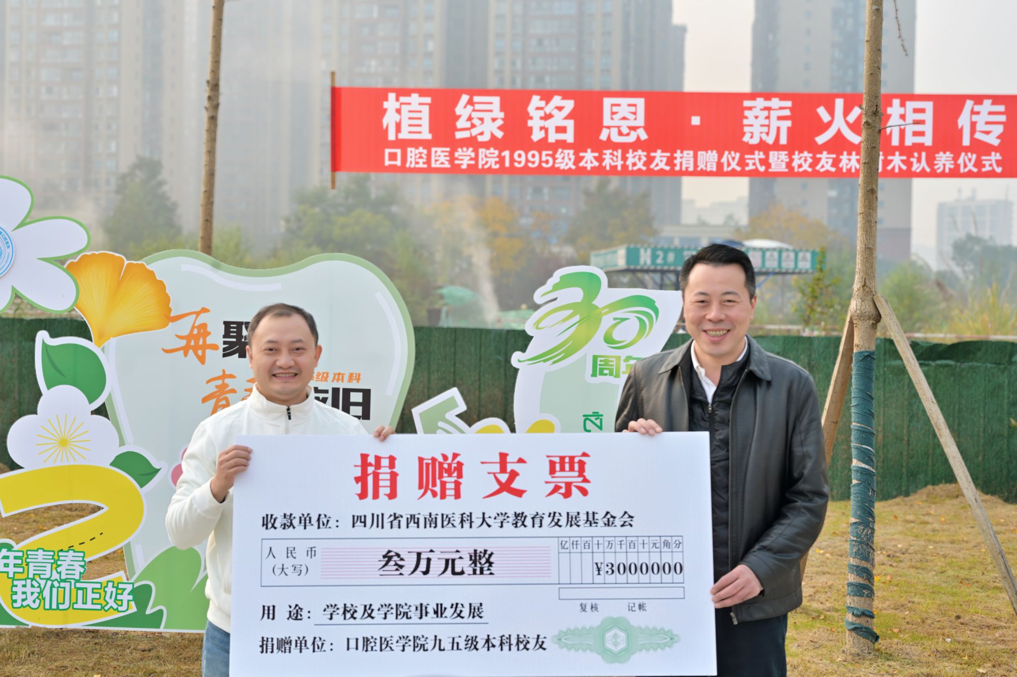 29日上午,校友们齐聚口腔医学院·附属口腔医院云峰路院区校友林,举行“植绿铭恩·薪火相传”95级校友捐赠仪式暨校友林树木认养仪式。仪式上,95级校友集体向母校捐赠三万元人民币,用于学校及学院事业发展,以行动诠释反哺之情。口腔医学院·附属口腔医院党委书记唐柯代表全院师生员工对95级校友的慷慨捐赠与深情厚谊表示衷心感谢。他表示,校友是学院最宝贵的财富,这份情谊将激励在校师生不断奋进,共同书写口腔医学事业的新篇章。