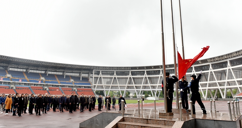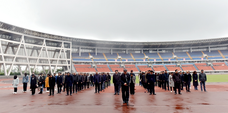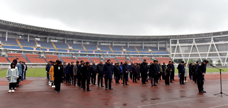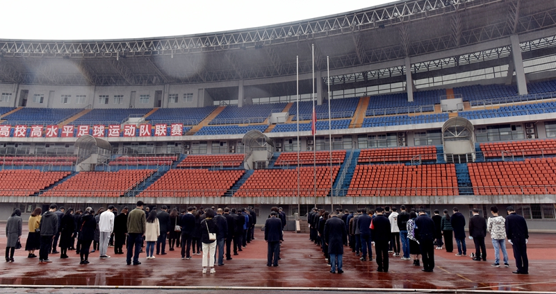 上午955分,在奥体中心,国旗缓缓升起,国旗升到旗杆杆顶,在短暂的定格后开始缓缓下降,在场的100余名师生行注目礼。鸣笛响起,大家低头为向在此次抗击新冠肺炎疫情牺牲的烈士和逝世的同胞们表示深切哀悼。