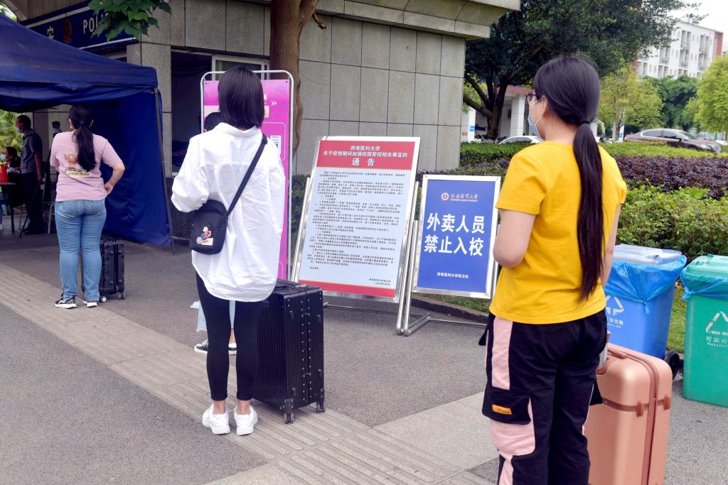 在红外线测温处,点位负责教师现场查看预演学生测温情况,所有院系辅导员早已在各自报到点准备就绪,对学生身份证件、手机健康码、14天行程卡截图等一一查验,对符合条件的学生发放入校通行证和健康包。在完成现场报到后,学生们通过向校卫队员展示入校通行卡或电子通行码,隔空就坐、乘坐免费校园摆渡车前往寝室办理入住。