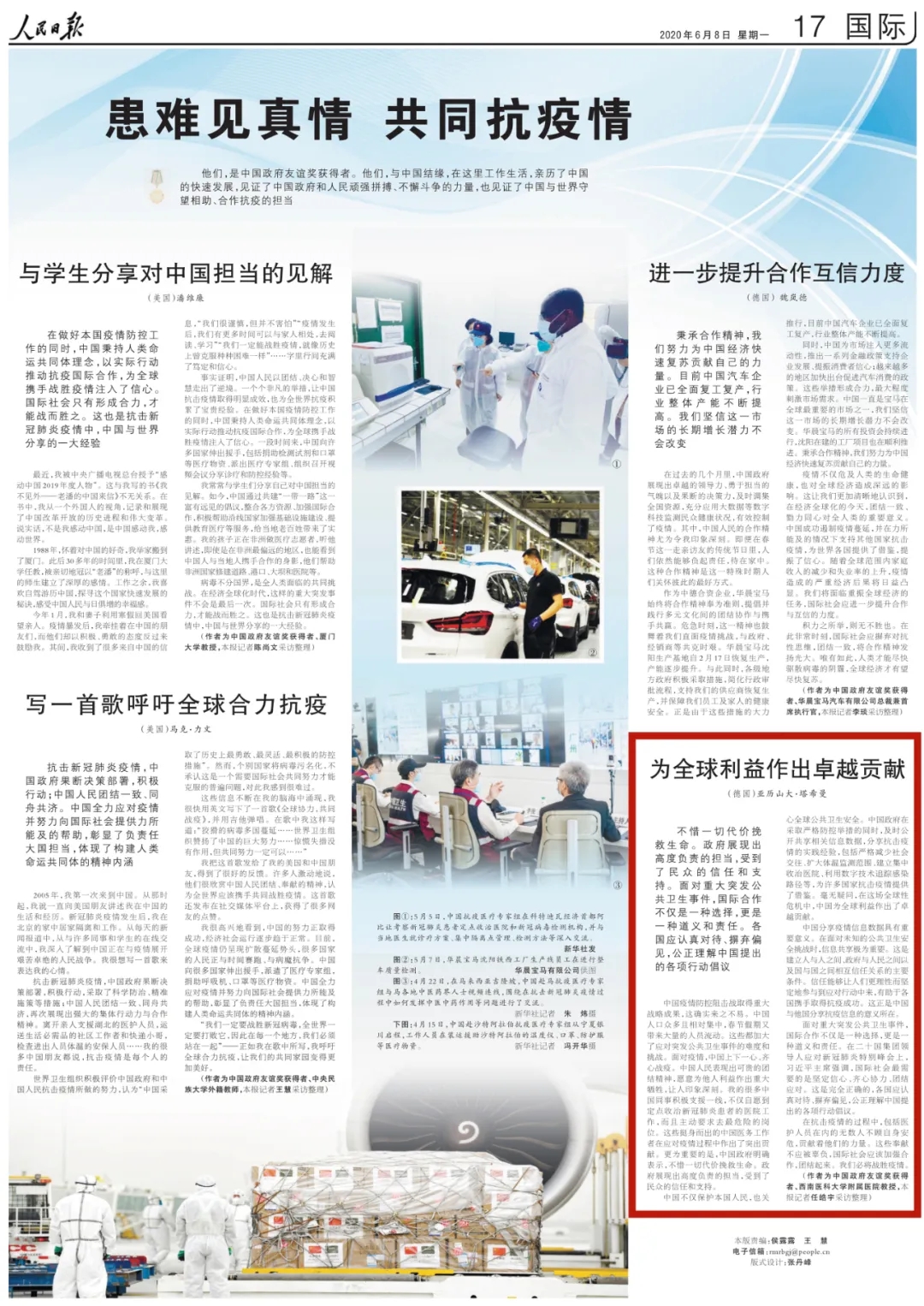 6月8日,《人民日报》17版刊发了学校附属医院德国籍教授亚历山大•塔希曼题为《为全球利益作出卓越贡献》的文章。