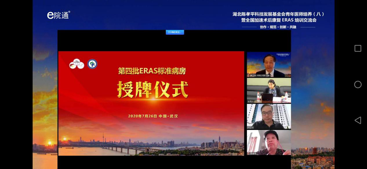 72426日,由国际肝胆胰协会中国分会ERAS专业委员会和湖北陈孝平科技发展基金会共同发起的全国加速康复外科ERAS线上培训参观交流会暨“肝胆外科ERAS标准病房”授牌仪式上,附属医院肝胆外科在全国第四批标准病房的申报中,获得全国“肝胆外科ERAS标准病房”授牌,这标志着附属医院肝胆外科在现代化外科建设过程中又迈出了坚实的一步。