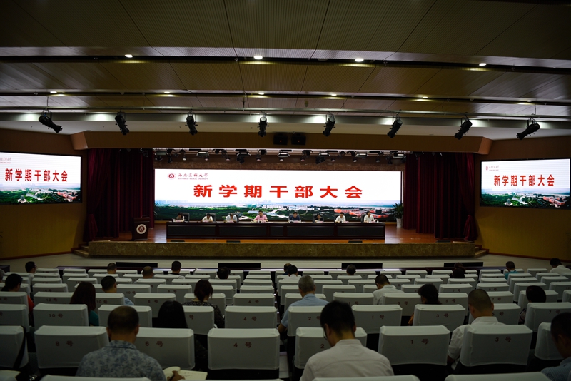 新学期,新起点,新征程。9月10日下午,学校在城北校区召开新学期干部大会,对2020年下半年党政主要工作进行全面安排部署。会议以线上+线下的形式召开,全体校领导、处级领导干部在主会场德诚楼学术报告厅参会,全体退出实职处级干部、科级干部,校本部教研室、实验室主任,支部书记,三附院两办、学生科、教务科、研究生科负责人等通过观看视频直播方式参会。会议由党委书记廖斌主持。