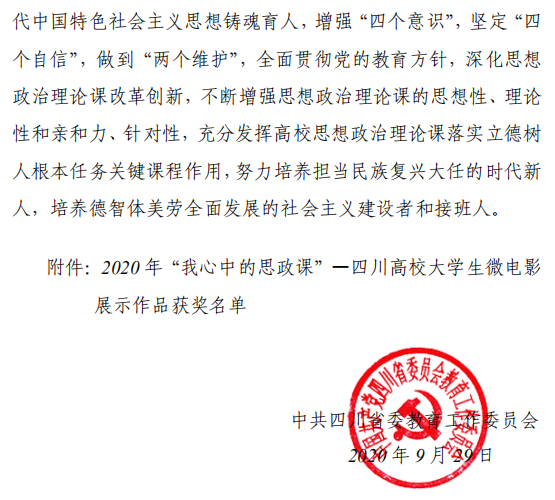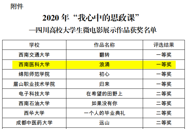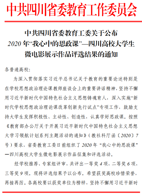 日前,由我校推送的“我心中的思政课”微电影作品——《浪涌》荣获第四届四川高校大学生微电影展示作品一等奖。该作品由党委宣传部、马克思主义学院、团委、教务处、学生部在今年暑假期间共同组织完成。