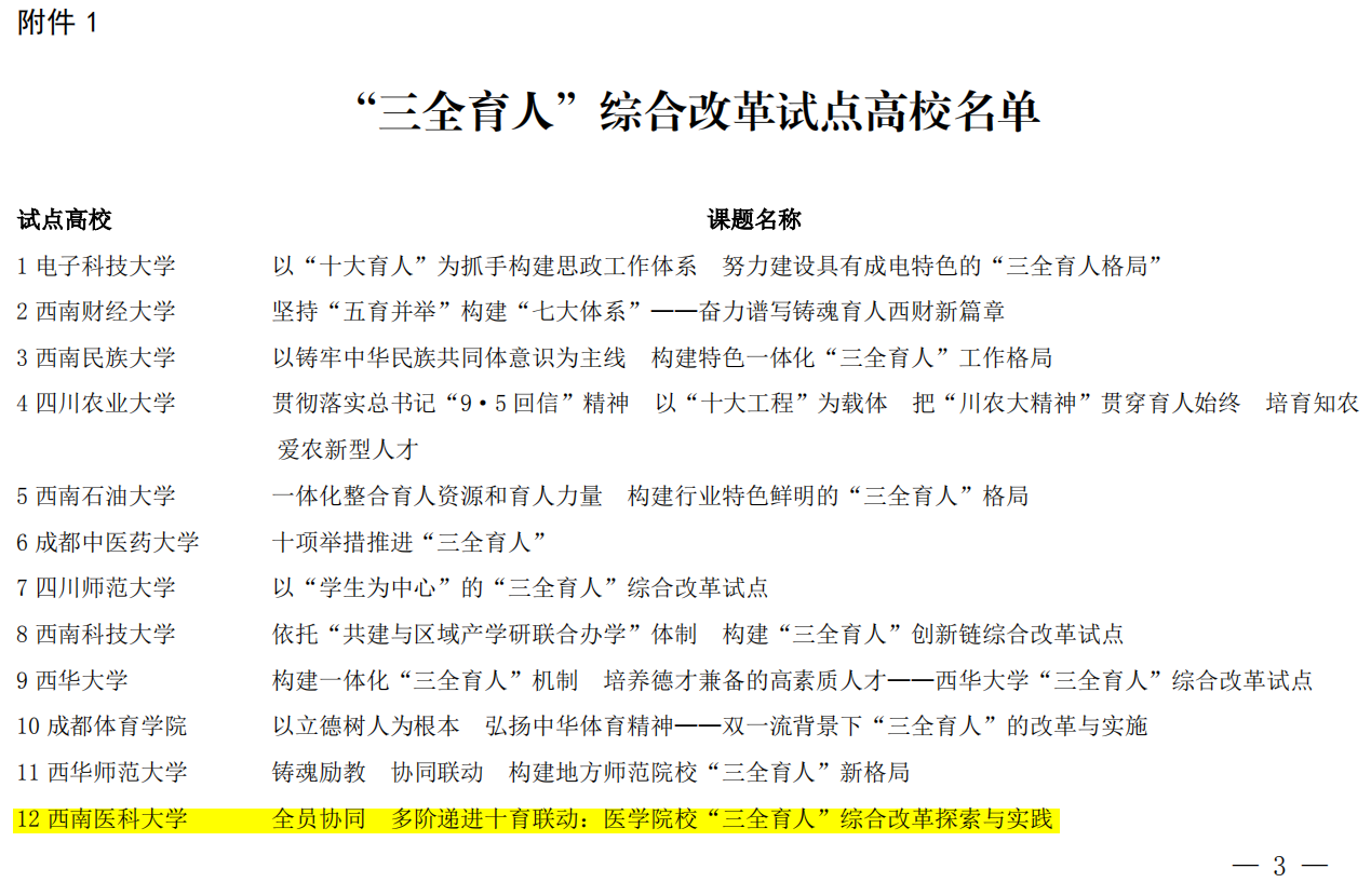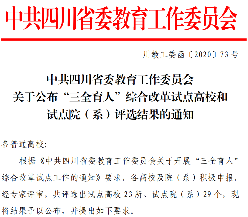 日前,省委教育工委发布《中共四川省委教育工作委员会关于公布“三全育人”综合改革试点高校和试点院(系)评选结果的通知》,我校成功入选四川省“三全育人”综合改革试点高校。