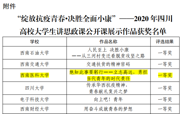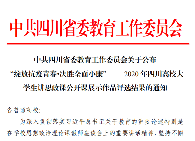 日前,我校在四川省2020年英国上市公司365新时代中国特色社会主义思想大学习领航计划系列主题活动中再传捷报,由学校推送的大学生“讲思政课公开课”展示作品《绝知此事要躬行——立志高远勇担当代青年的时代责任》喜获全省一等奖,并将参加全国大赛的角逐。