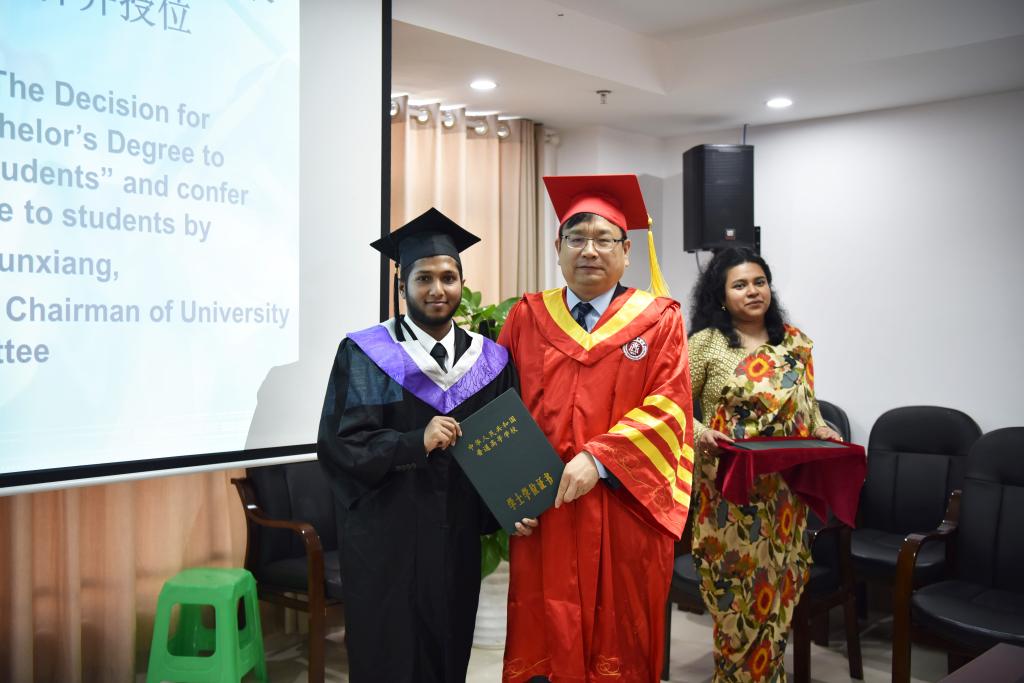 教师代表临床医学院肖秀丽教授在发言中,对学有所成的毕业生表示祝贺,并希望大家珍重师生情。国际教育学院留学生科副科长李雪茹分享了工作感悟。留学生代表Mejbah Uddin Rakib和家长代表Sabnam Nilufa也对学校为留学生教育提供优质管理服务表示了感谢。