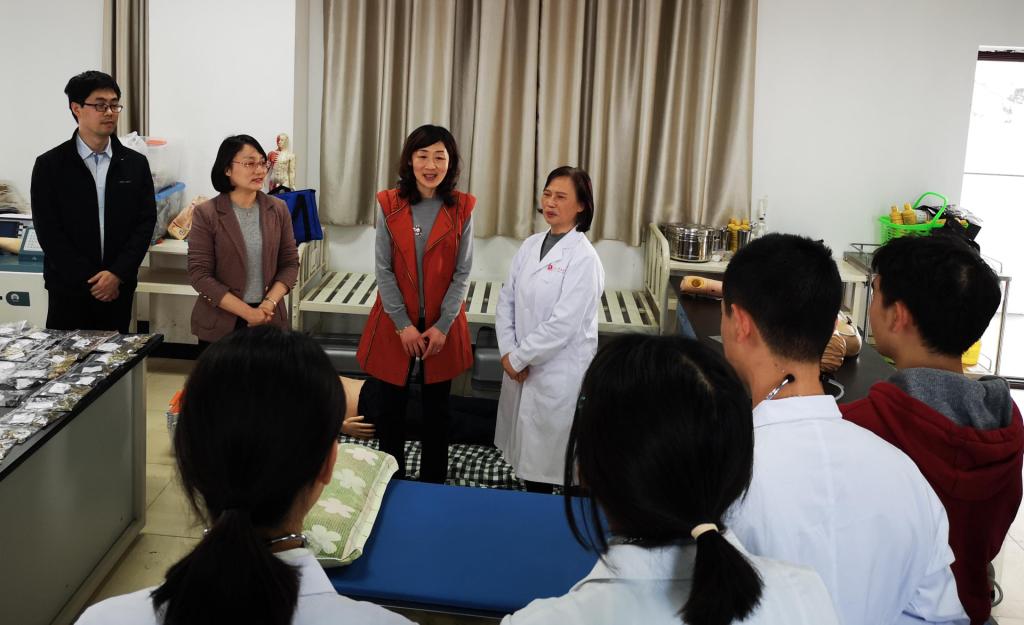 2月24日,党委常委、副校长何涛,教务处处长郑小莉、副处长刘力一行3人在中西医结合学院副院长徐厚平等陪同下看望备战“第十届中国大学生医学技术技能大赛”的学生,并和同学进行亲切交流。