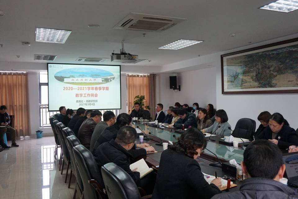 为全面做好2020-2021学年春季学期教学各项工作,确保教学工作顺利开展,3月4日下午,学校在城北德诚楼521会议室组织召开2020-2021学年春季教学工作例会。学校党委常委、副校长何涛,教务处、党委宣传部、学生工作部、人事处、发展规划处、基建后勤处、财务管理处、国有资产管理处、教育评价与教师发展中心等相关职能部门负责人,学校专职教学督导员,以及各二级院系相关领导共计60余人参加了会议。会议由教务处副处长刘力主持。