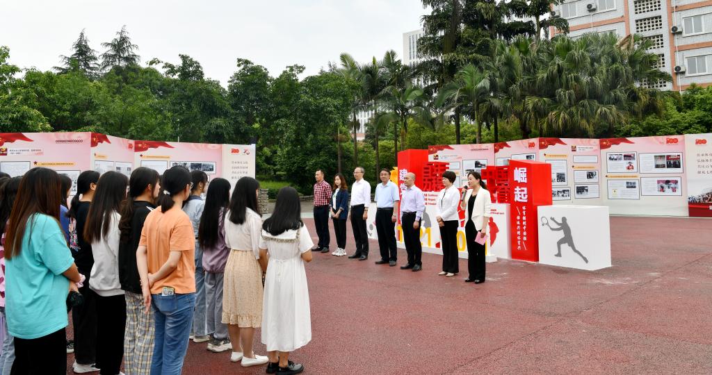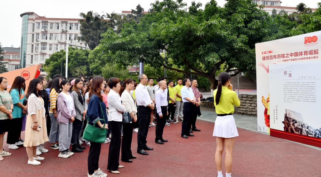5月26日下午,由学校体育运动委员会主办、体育学院承办的“颂百年风华 扬体育精神”专题展在青年广场开展。学校党委副书记、纪委书记、体委主任李尚志,党委常委、组织部部长冯天明,党委常委、宣传部部长柏珂,学生工作部部长谭群英,校团委书记石慧,体育学院院长王定宣及师生代表50余人参加开展仪式。仪式由体育学院党总支书记邹小萍主持。