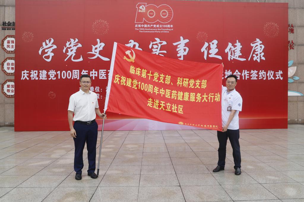 活动中,李志代表医院党委向临床第十党支部和科研党支部支部书记代表授旗,与会领导也为现场群众发放了中药香囊。