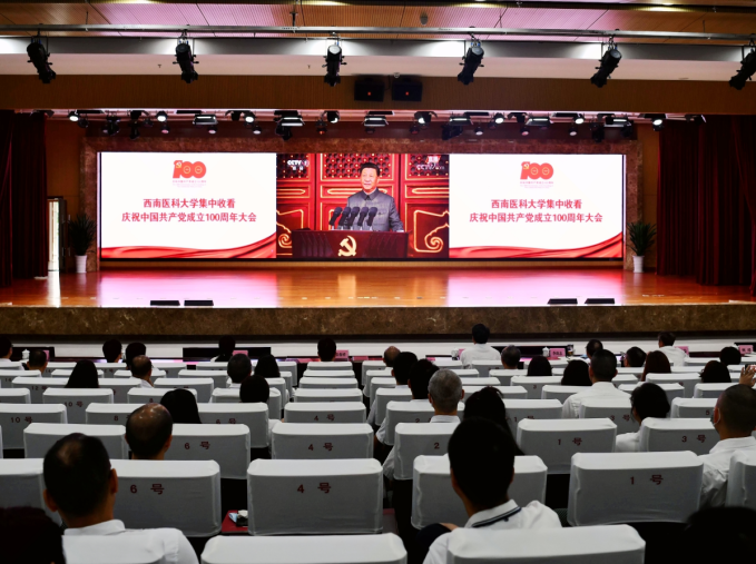 为隆重庆祝中国共产党成立100周年,学校党委组织广大师生员工收听收看庆祝中国共产党成立100周年大会。全体校级党委理论学习中心组成员、处级领导干部、学生辅导员,思想政治理论课教师、专业教师和学生代表在城北校区第一学术报告厅观看大会。各二级党组织组织本单位师生员工在会议室、办公室、教室、门诊等分会场通过电视、网络等观看大会。全校万余名师生共同见证了这一伟大时刻。