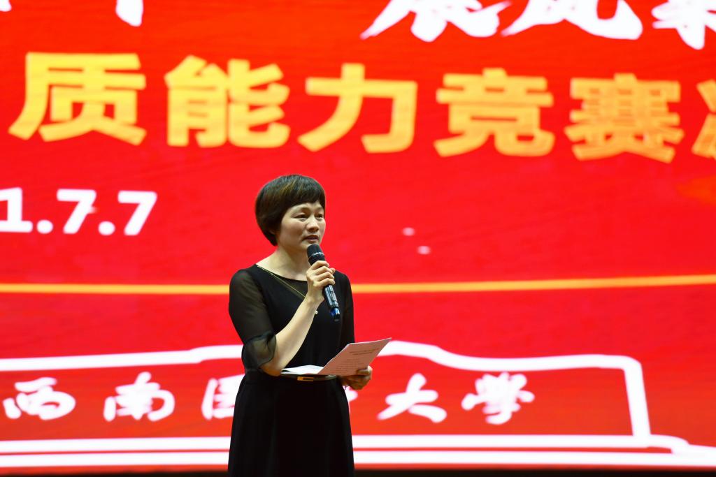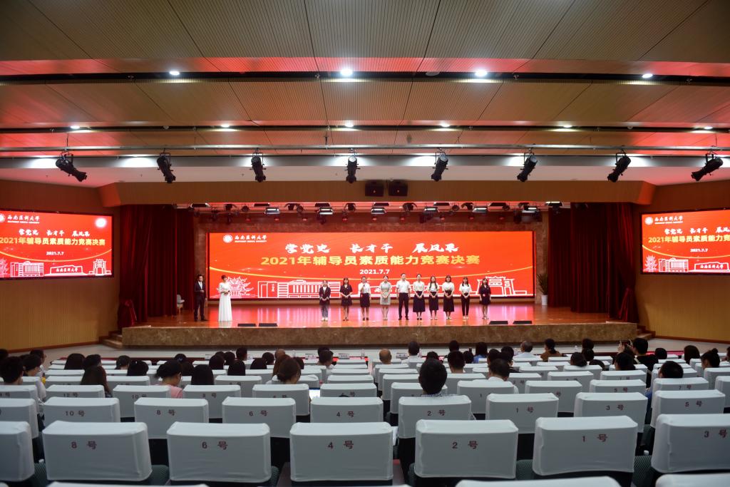 77日下午,学校首届“学党史 长才干 展风采”辅导员素质能力竞赛决赛在城北校区第一学术报告厅举行。学校党委书记廖斌,党委副书记、纪委书记李尚志,党委副书记刘毅,党委常委、副校长彭钢,党委常委、副校长何涛,党委常委、组织部部长冯天明,党委常委、宣传部·统战部部长柏珂,人事处处长刘文胜,教育评价与教师发展中心主任赵琼,学生工作部(处)长谭群英,团委书记石惠应邀出席并担任评委。全校学生政工干部以及即将脱产从事辅导员工作的专任教师共计120余人现场观摩学习。大赛由儿科学系学生科副科长张玲萍和体育学院辅导员李正才主持。