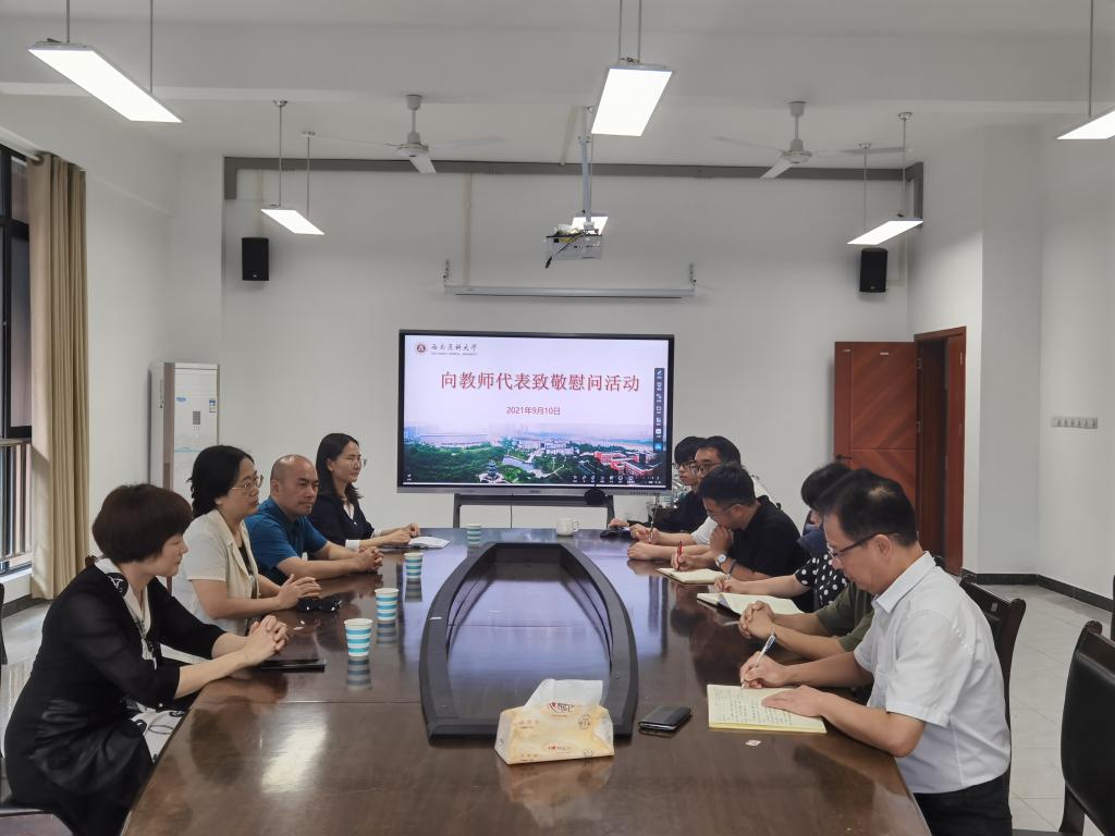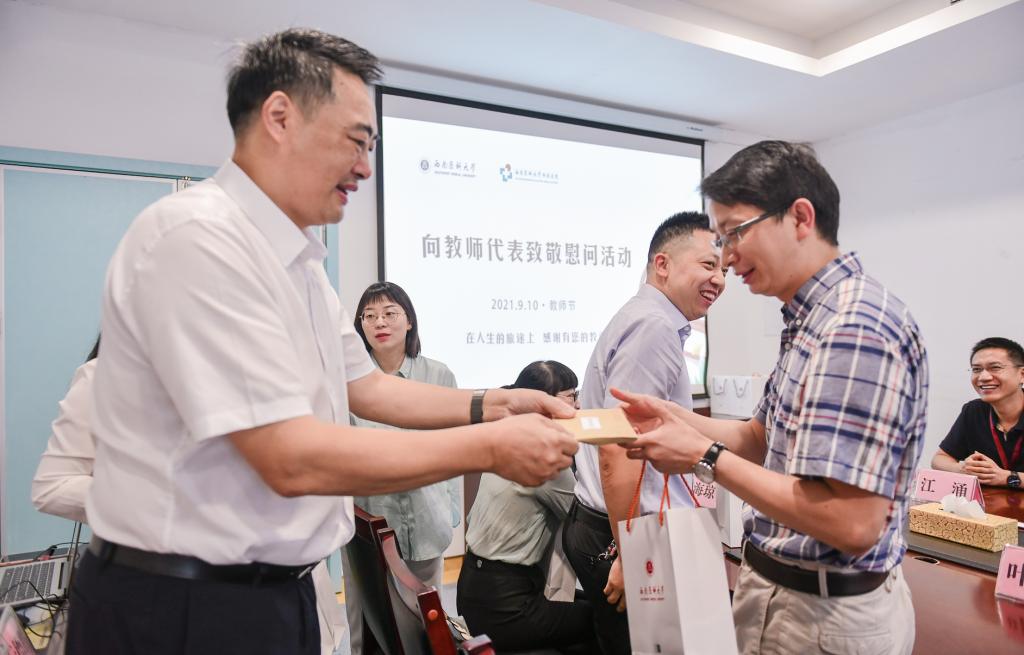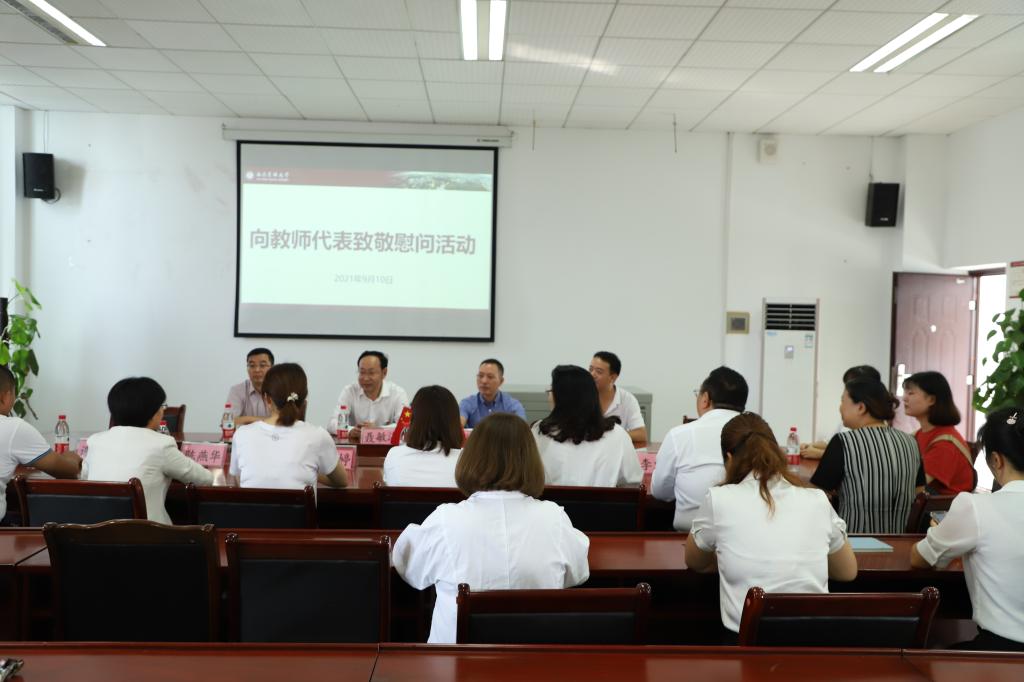 当天上午,由学校校领导廖斌、张春祥、李尚志、刘毅、刘广益、彭钢、何涛、聂敏海带领相关职能部门负责人和学生代表,分别深入各二级院系和离退休工作处,向在教学、科研、医疗一线工作,业绩突出、家庭困难的教师代表致以节日慰问。人事处、工会、团委和学生会为教师代表精心准备了贺卡和礼物,让广大师生深刻感受到了尊师重教的仪式感、荣誉感和幸福感。期间,学校还开展了“为教师亮灯”公益活动,在忠山、城北校区LED屏幕滚动播放“老师您好!”标语,学校官微也推送了教师节系列活动的宣传报道,向全校教职工致以节日的祝福。