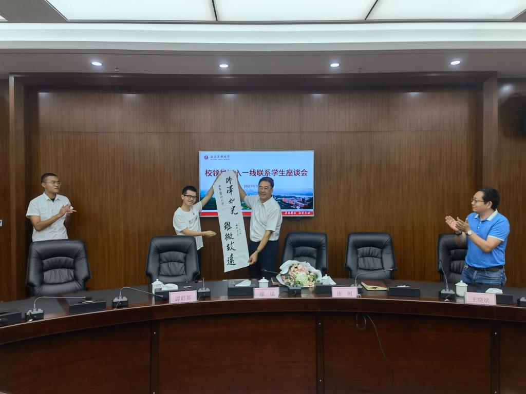 座谈会上,学生代表汇报了班级基本情况,分享了三年来班级所取得的学业、科研、素质拓展等方面成绩,同学们表示将坚定理想信念,传承医大红色基因,继续奋力拼搏,争取更大成绩。正值第三十七个教师节,学生代表还向廖斌献上鲜花和学生书法作品,表达对英国上市公司365全体老师的感激与祝福。