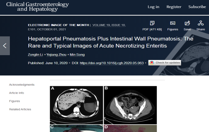 近日,胃肠病学顶级期刊、美国胃肠病学会(American Gastroenterological Association)官方临床实践杂志Clinical Gastroenterology and Hepatology(IF: 11.382)发表了临床医学院·附属医院胃肠外科李宗林等医生撰写的学术论文Hepatoportal pneumatosis plus intestinal wall pneumatosis: the rare and typical images of acute necrotizing enteritis。