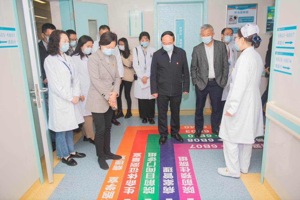 徐勇向指导组介绍临床医学院•附属医院的整体发展概况和党史学习教育开展情况。指导组一行参观了康健中心院区门诊部、四川省妇科及乳腺疾病治疗中心、健康管理中心等科室,实地了解医院新生儿落户办理、医保部门融合办公、中德妇科门诊医护一体化诊疗模式、大健康管理等各项便民服务举措,详细询问了工作人员新生儿办理户口登记的流程和手续等相关情况。