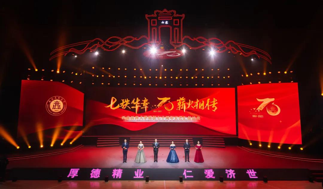 第三篇章“使命•共济”通过舞蹈《誓言》让大家看到在新冠肺炎疫情暴发的危难之际,西南医大人挺身而出的责任与担当。由学校师生、校友们票选出的6首各个时代的经典校园歌曲联唱《时间表》更让大家感受到西南医大的精神气质和奋进力量。