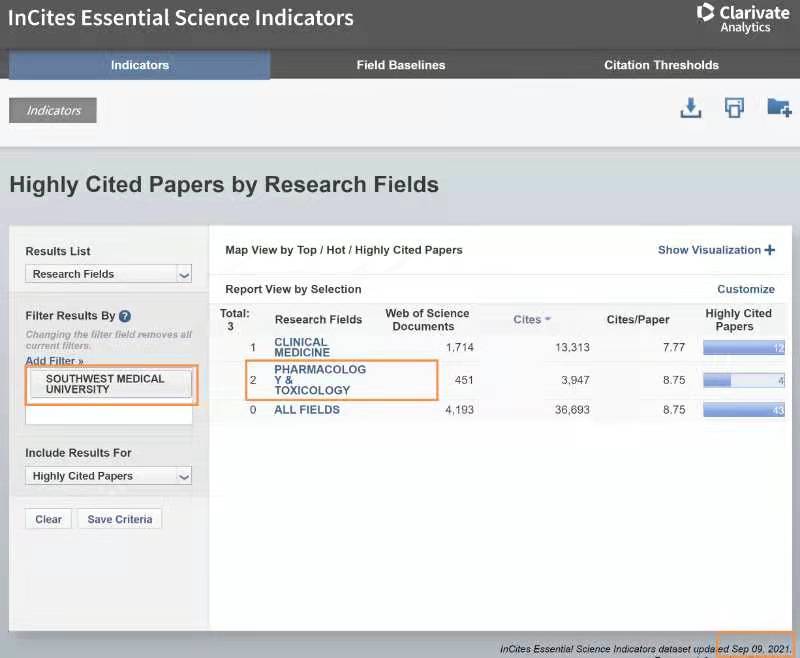 药理学与毒理学学科首次进入ESI学科排名前1%