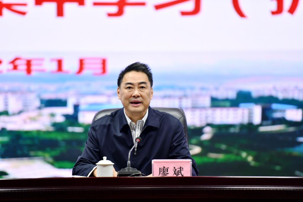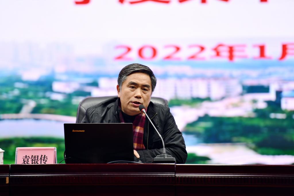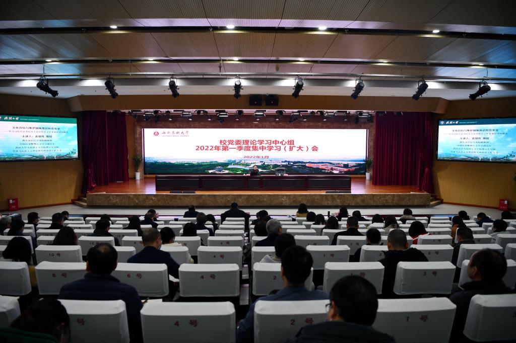 1月6日下午,学校在城北校区德诚楼学术报告厅召开校党委理论学习中心组集中学习(扩大)会。教育部长江学者特聘教授、武汉大学马克思主义学院博士生导师袁银传教授应邀作题为《文化自信与维护国家意识形态安全》的专题讲座。中心组组长、党委书记廖斌主持会议。