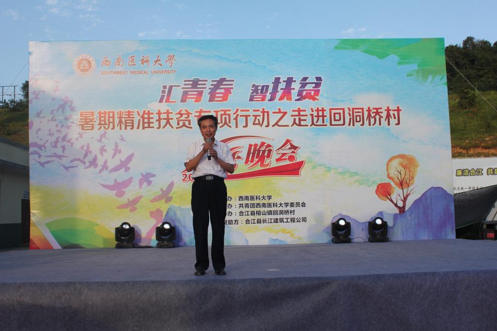 晚会结束前,郑勇作了讲话,代表合江县委对学校长期以来对回洞桥村扶贫工作的大力支持表示感谢。他指出,物质脱贫和精神脱贫同等重要,此次文艺汇演在给村民们带来欢乐的同时,也提高了村民的文化修养,陶冶了情操,加强了精神文明建设,对实现精神脱贫起到了很好的促进作用,下一步回洞桥村扶贫工作将加大文化扶贫项目的推进,进一步丰富村民们的业余文化生活。