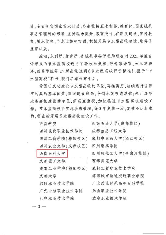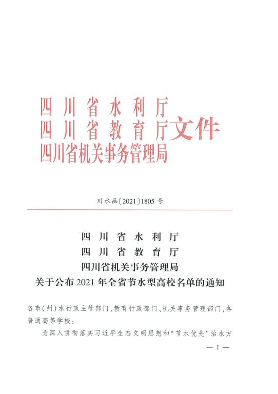 近日,经四川省水利厅、省教育厅、省机关事务管理局联合对我校创建“节水型高校”进行现场验收,通过专家评审、公示等程序,我校达到《节水型高校评价标准》,被授予“节水型高校”荣誉称号。