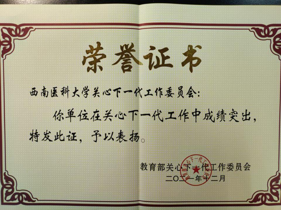 2021年,在学校党委坚强领导、全体关工委委员共同努力下,学校关工委成绩突出,一年内连获教育部、省、厅、市四级荣誉:6月,荣获四川省关工委先进集体、11月荣获四川省教育系统关工委先进集体、10月荣获泸州市关工委先进集体,12月,学校关工委再获佳绩,被教育部关心下一代工作委员会喜评为先进集体。据悉,此次教育部关工委评定的先进集体,四川省各级各类学校仅有8个。