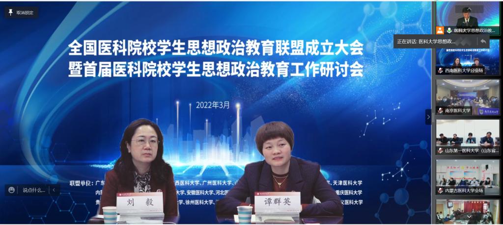 3月11日上午,全国26所独立设置医科院校“云端”相聚,召开全国医科院校学生思想政治教育联盟成立大会暨首届医科院校学生思想政治教育工作研讨会。会议由天津医科大学主办,我校作为联盟成员单位,在德诚楼220会议室设分会场,学校党委副书记刘毅、学生工作部部长谭群英、二级院系辅导员代表参加了会议。会议分为成立仪式和主旨发言两个环节。