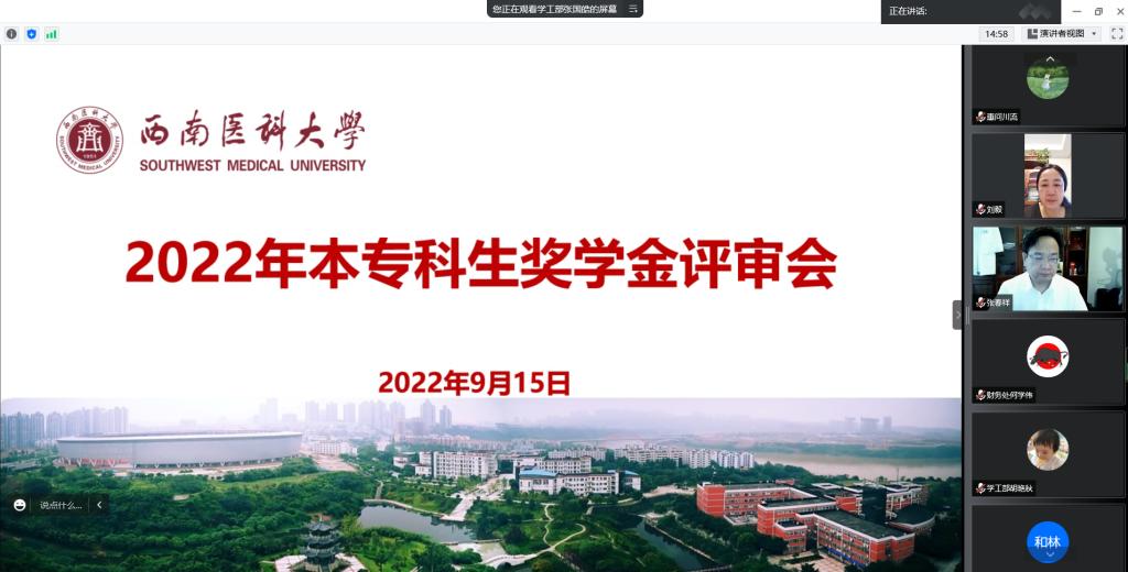 9月15日上午,学校2022年本专科生奖学金评审会以视频会议形式召开。学校党委副书记、校长张春祥,党委副书记刘毅,学校学生奖励评审工作领导小组专家等共12人参加了评审会。会议由学生工作部部长、学生奖励评审工作领导小组办公室主任谭群英主持。