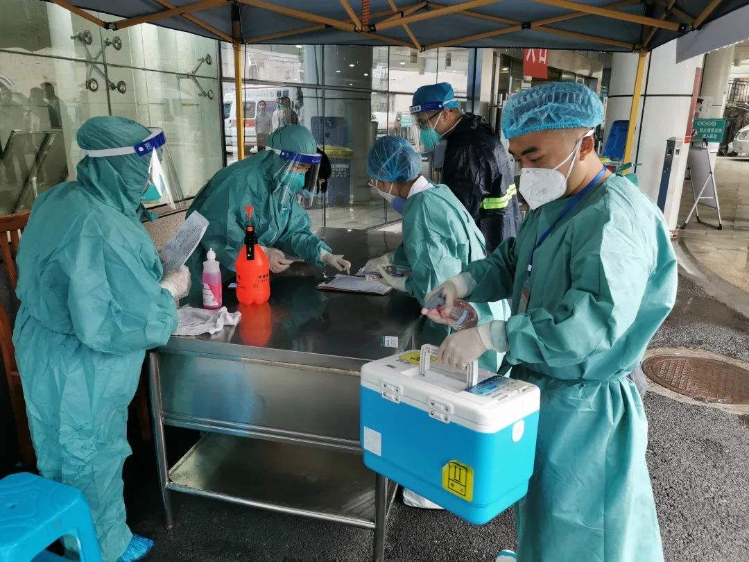 虽然身处被静态管控的区域,但临床医学院·附属医院的党员同志们却纷纷向所在社区、所处街道提出申请,自愿报名参加疫情防控工作,变身“白墩墩”“蓝精灵”,满腔热忱就近帮助社区进行核酸采样。每天凌晨四五点,医院两批300人的核酸检测队就得奔赴江阳区和泸县4个社区58个采样点。为了快速、准确出具核酸检测结果,医院60余名医学检验部分子检验人员连轴运转,承担一次次日检约2万管核酸检测任务。在大量人员转战四方、驰援多地和患者封控在住院楼中严禁外出的情况下,“留守”在医院大后方的100余名党员同志主动担当,承担了更多的额外工作,积极筹集与转运物资、为病房患者送餐、前移关卡查验绿码,全力保障医教研管服各项工作平稳运行。