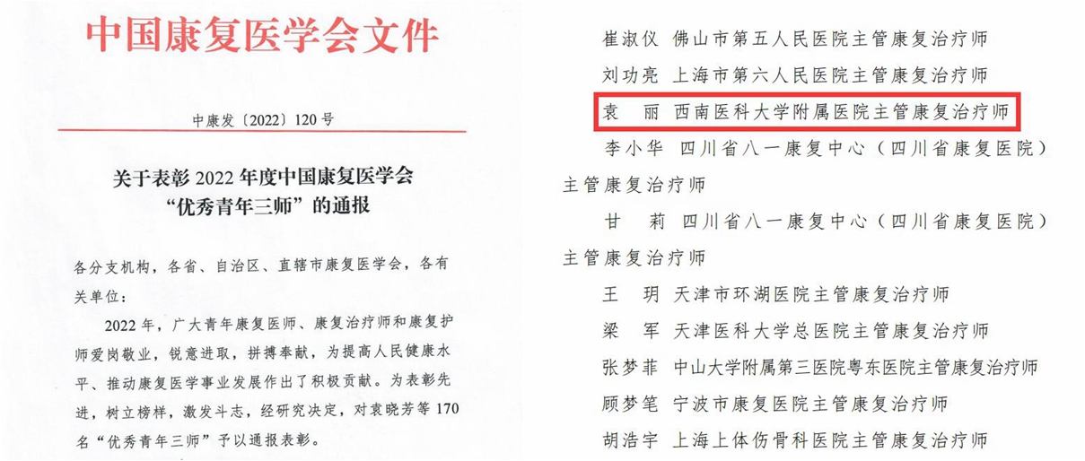 近日,中国康复医学会发布《关于表彰2022年度中国康复医学会“优秀青年三师”的通报》,学校康复医学系教师袁丽荣获“优秀青年康复治疗师”表彰。来自全国各级医疗机构的39名青年康复治疗师获此殊荣。