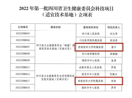 近日,四川省卫生健康委员会办公室发文,公布了2022年第一批四川省卫生健康委员会科技项目(适宜技术基地)名单。附属医院四川省妇科及乳腺疾病治疗中心(妇科)获批“四川省卫生健康委员会‘两癌’筛查适宜技术基地(区域示范)”,肝胆外科获批“四川省卫生健康委员会实用微创适宜技术基地(区域示范)”;附属口腔医院获批建设省卫健委口腔常用预防诊疗和护理适宜技术基地(区域示范)。