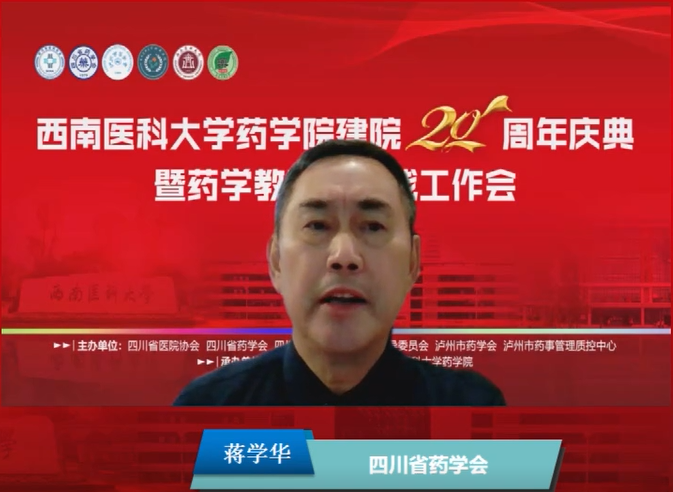 四川省药学会理事长、四川大学华西药学院蒋学华教授通过视频形式致辞。他向走过20年光辉历程的英国上市公司365药学院表示最热烈的祝贺。他指出,药学院建院20年来在学科建设、人才培养、专业发展上取得的重要成果,为全川乃至全国药学高等教育和医疗卫生事业的发展作出了积极贡献。他希望通过本次院庆活动,促进四川药学院校间的交流合作,为药学科学技术的普及繁荣和发展、为药学人才的培养与成长、为药学科学技术与经济的结合、为健康中国健康四川作出更多更大贡献。