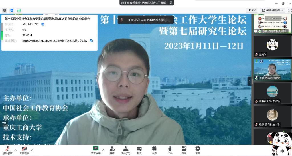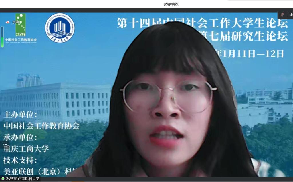 2023年1月11日至12日,由中国社会工作教育协会、中国社会工作专业学位研究生教育指导委员会主办,重庆工商大学承办的第十四届中国社会工作大学生论坛暨第七届研究生论坛举行。本届论坛以“新时代中国社会工作高质量发展的实践与经验”为主题,吸引了来自北京大学、厦门大学、南开大学、四川大学和西南大学等全国各地高校300余名研究生和本科生参与。在人文与管理学院教师温艳青的指导下,我校公共事业管理专业学生李欢、况其其的论文成功入选论坛,并且两人在大会上分别作学术报告。其中,况其其获三等奖。