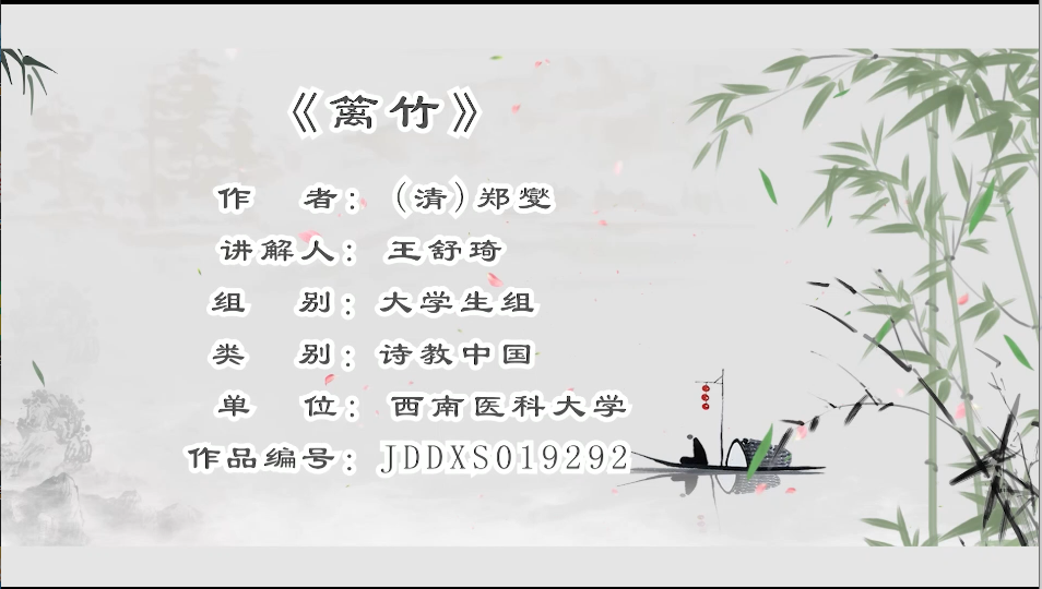 近日,第四届中华经典诵写讲大赛获奖名单公布,我校共有4部选送作品获奖。其中,护理学院本科生王舒琦作品《篱竹》获“诗教中国”本科生组二等奖;人文与管理学院教师杨惠麟作品《望江南·多少恨》获“诗教中国”教职工组三等奖;临床医学院教师李开明作品《朱痕》获“篆刻中国”教职工组优秀奖;国际教育学院留学生何天宇作品《登鹳雀楼》获“诗教中国”留学生组优秀奖。