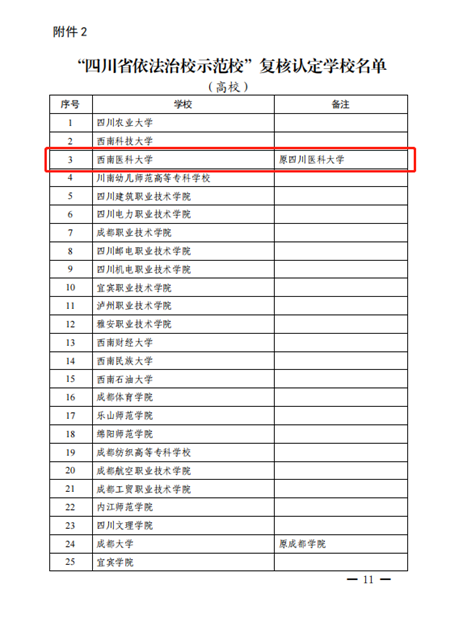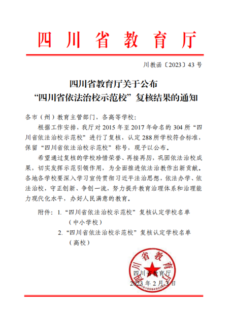 日前,四川省教育厅对2015年至2017年命名的304所“四川省依法治校示范校”进行了复核,认定288所学校符合标准。我校高质量通过复核认定,顺利保留“四川省依法治校示范校”称号。
