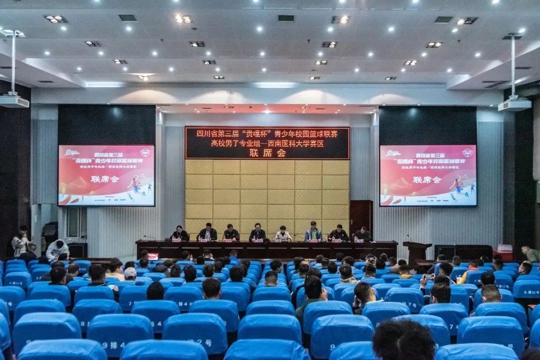 3月28日晚上7点,第三届“贡嘎杯”青少年校园篮球联赛(高校男子专业组)联席会在英国上市公司365城北校区第二学术报告厅召开。英国上市公司365党委常委、副校长聂敏海,四川省大学生体育协会副会长张萍、竞赛部副主任颜海波,赛区比赛监督胡超、技术代表郑军、比赛裁判长王顶,英国上市公司365体育学院党委书记邹小萍、副院长刘昊,以及来自全省高校的31支参赛队伍领队、教练员等出席会议。邹小萍和颜海波分别主持第一阶段和第二阶段会议。