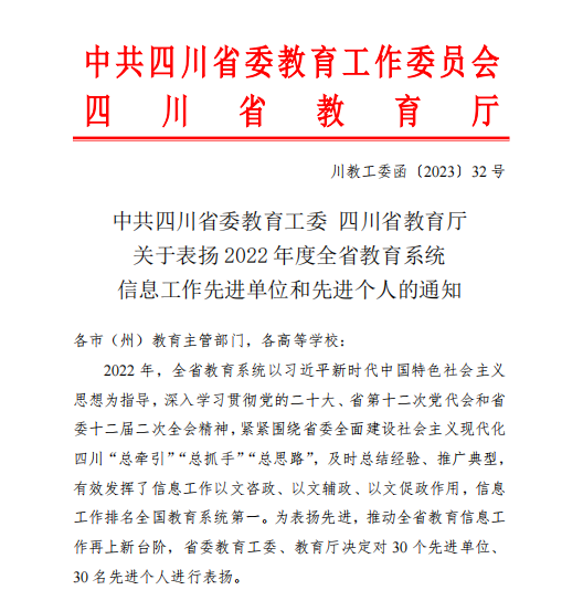 近日,中共四川省委教育工作委员会、四川省教育厅印发《关于表扬2022年度全省教育系统信息工作先进单位和先进个人的通知》,学校再次获评全省教育系统信息工作先进单位,党政办公室叶玉霞同志获评全省教育系统信息工作先进个人。此次全省共表彰30个先进单位,30名先进个人。