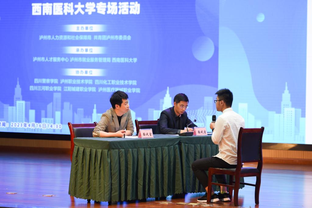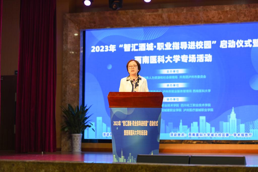 4月16日下午,由泸州市人力资源和社会保障局、共青团泸州市委员会主办的2023年“智汇酒城•职业指导进校园”启动仪式暨首场活动,在我校城北校区第一学术报告厅隆重举行。学校党委副书记刘毅,泸州市人社局党组成员、市人才服务中心主任陈林,共青团泸州市委副书记刘波,在泸高校相关领导出席活动。我校招生就业处处长谭群英、研究生院党委书记朱小平、招生就业处副处长崔继东、团委副书记王路军,以及各二级院系学生科长、毕业年级辅导员、《职业发展与择业指导》任课教师及学生代表共450余人参加活动。