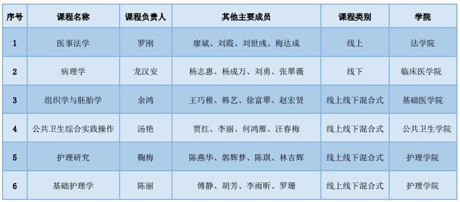 近日,教育部公布了《教育部关于公布第二批国家级级一流本科课程认定结果的通知》(教高函〔2023〕7号),我校《医事法学》课程认定为线上一流课程;《病理学》课程认定为线下一流课程;《基础护理学》等4门课程认定为线上线下混合式一流课程。