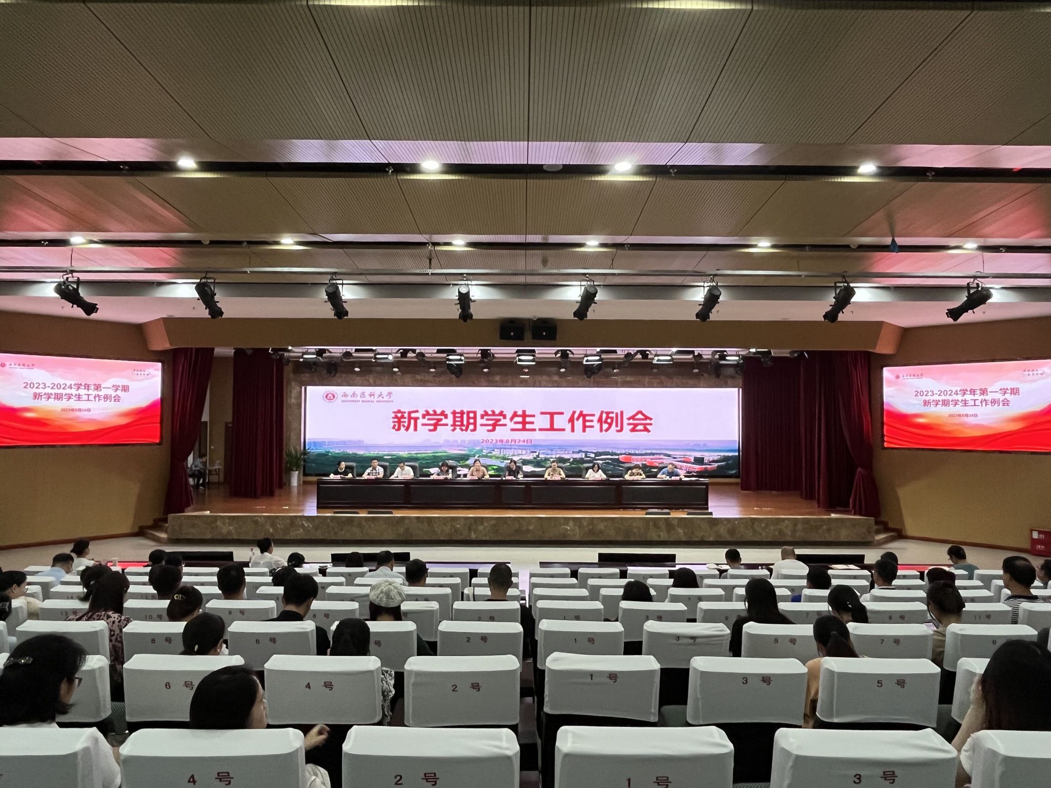 8月24日下午,2023-2024学年第一学期新学期学生工作例会在城北校区第一学术报告厅召开。学校党委副书记刘毅出席会议并讲话,党政办公室、党委宣传部、武装部、基建后勤处、财务管理处主要负责人,学生工作部、团委全体人员,二级院系专兼职辅导员共计120余人参加了会议。会议由学生工作部部长谭群英主持。