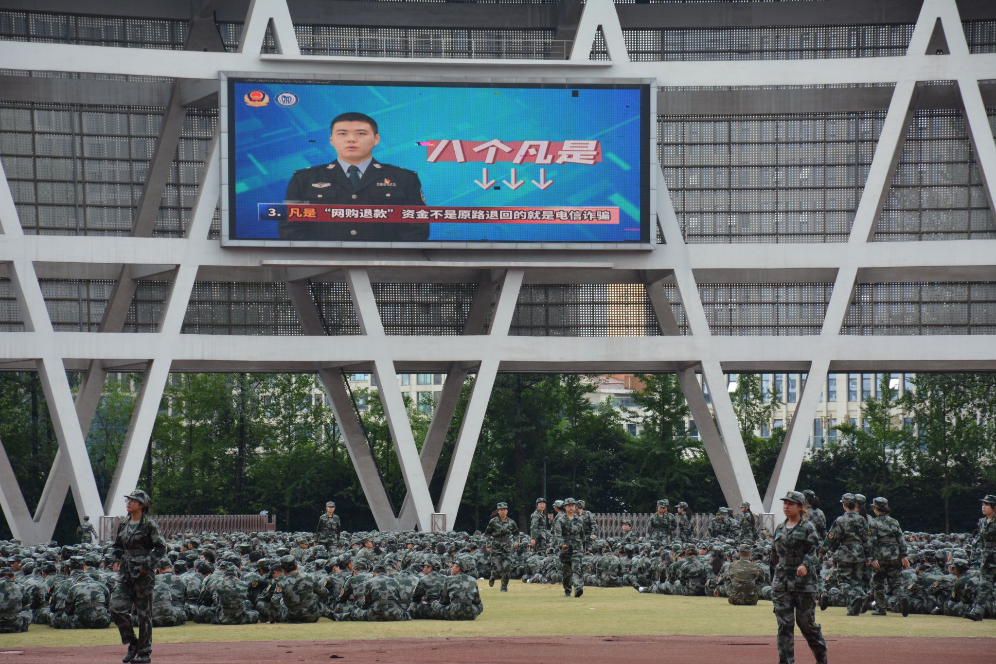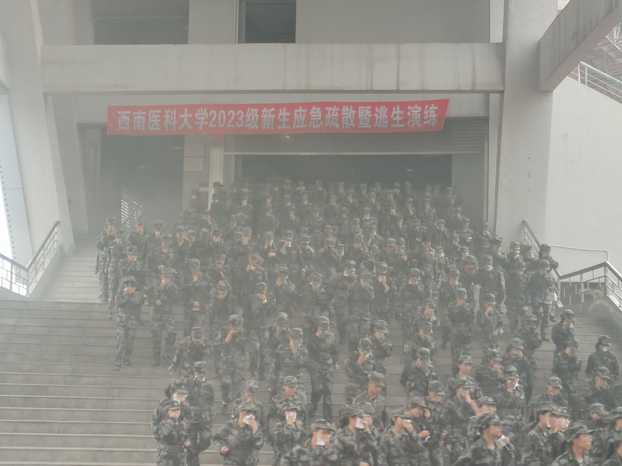 为加强2023级学生的防灾减灾意识,提高学生在火灾、地震、恐怖袭击等突发公共事件下的应急反应和自救、互救能力,9月12日下午,学校在城北校区奥体中心主体育场组织开展2023级新生应急疏散暨逃生演练。学校相关职能部门、院系负责人,学生辅导员,承训部队官兵、辖区派出所人员及2023级全体新生参加了演练。