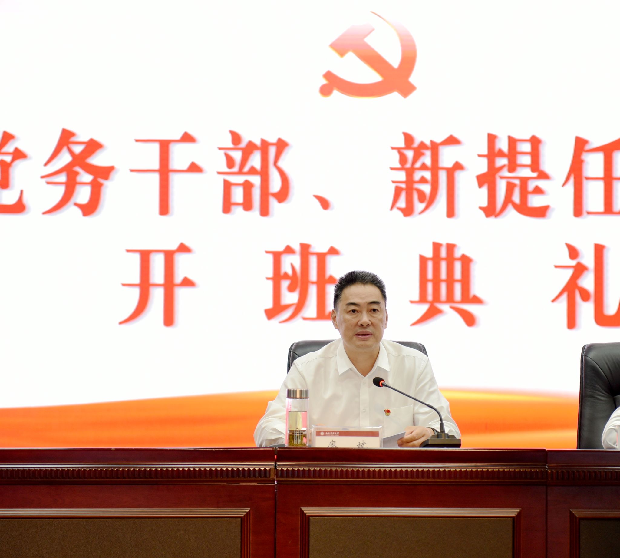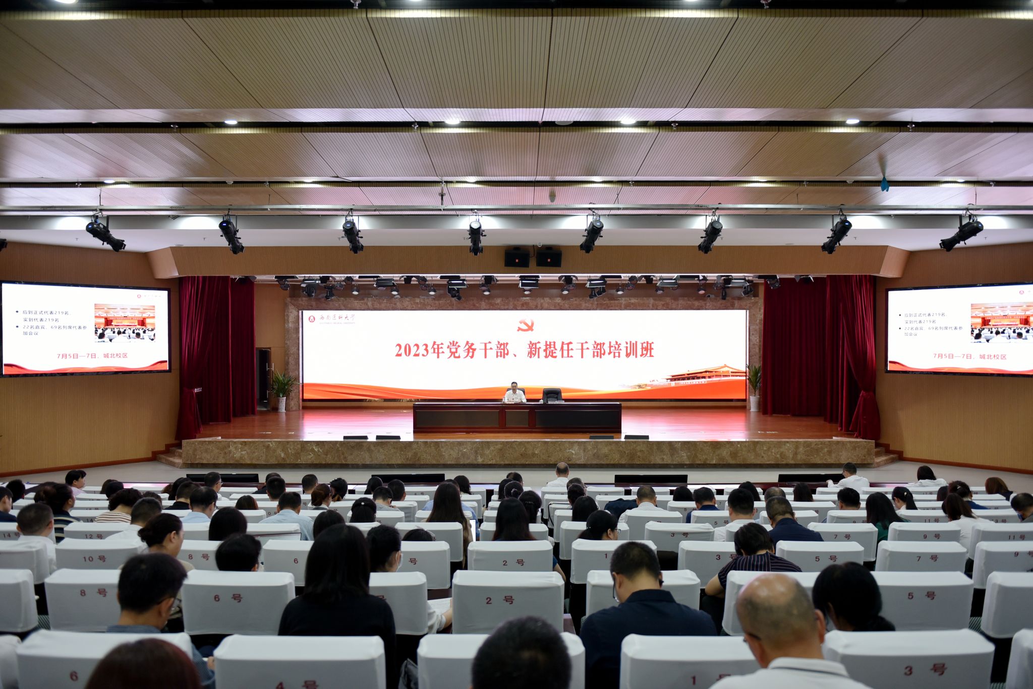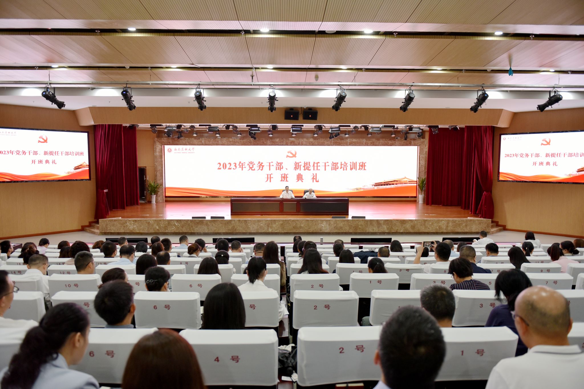 按照学校党委工作安排部署,9月26日上午,“贯彻党代会精神、奋进启航新征程 学校2023年党务干部、新提任干部培训班”开班典礼在城北校区第一学术报告厅举行。学校党委书记廖斌出席并作动员讲话,党委常委、组织部部长冯天明主持开班典礼。全校二级党组织书记、副书记,附属医院党委、附属中医医院党委下辖党总支书记,专职组织员,全校党支部书记以及2022年以来新提任的处科级领导干部共计260余人参会。