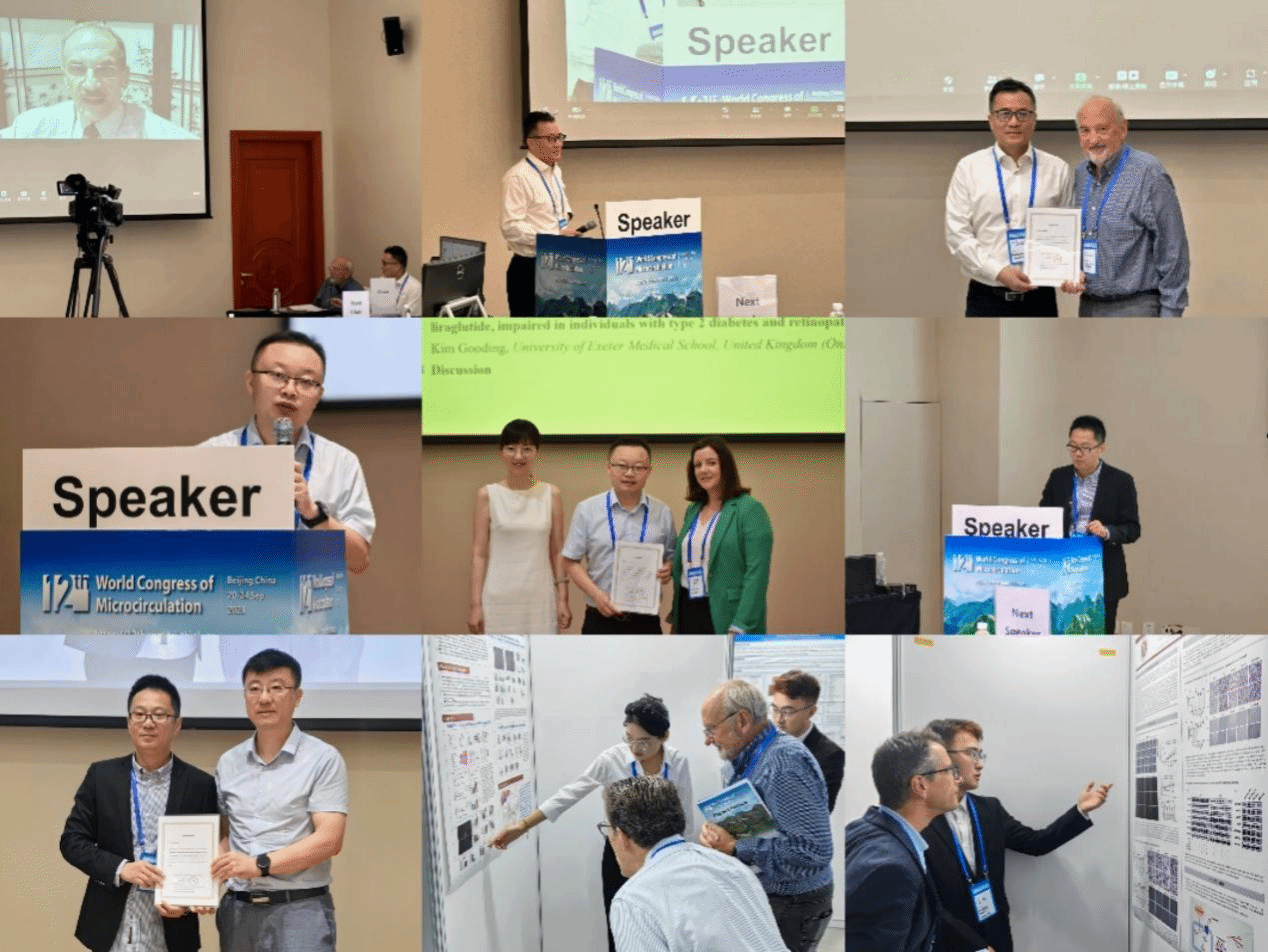 本次会议包括6场主旨报告、3场获奖报告、9场大会报告、41场专题报告、7场青年专题报告、13场卫星会议以及多场壁报等。吴剑波主持了“Microcirculation, Stem cells and Tissue Repair”专题报告会,并作了题为“Regulation of Photo modulation in Angiogenesis”的学术报告。在“Vascular Hyperpermeability”专题报告会中,研究员罗茂作了题为“Effects of sulforaphane on MGO-induced inflammatory response and pyro ptosis in Human Umbilical Vein Endothelial Cells”的学术报告;在“Pericyte”专题报告会中,副研究员王立群作了“Glycation of fibronectin inhibits PDGF-BB signaling activation by uncoupling PDGF receptor-β-α5β1 integrin cross-talk”的学术报告。